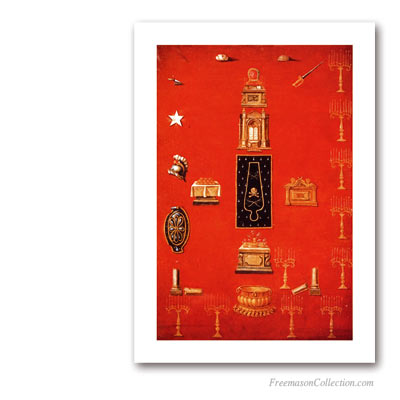 Tracing board from Mons. The 14°grade is represented here by various symbols: Ark of the Covenant surmounted by 2 cherubs, tables of Law, table with twelve breads, altar of the perfumes and bronze sea.